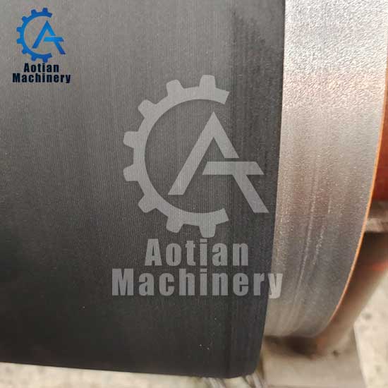 造纸托辊:包括中空辊芯,在辊芯内腔两端分别固定安装有阶梯型长轴和阶梯型短轴,在中空辊芯的外表面圆周向通体包覆有胶层,所述辊芯内腔为阶梯孔状结构,阶梯型长轴和阶梯型短轴分别安装在辊芯内腔阶梯孔外端孔内,同时在辊芯端面设置有平衡机构,所述平衡机 构包括分别固定安装在辊芯端面与阶梯型长轴和阶梯型短轴之间的两个平衡圈。托辊结构紧凑、设计合理,辊体直径较小,整体重量较轻,生产制造成本低,进而能够降低客户使用成本,同时又能满足辊体的静平衡要求,且使用方便。